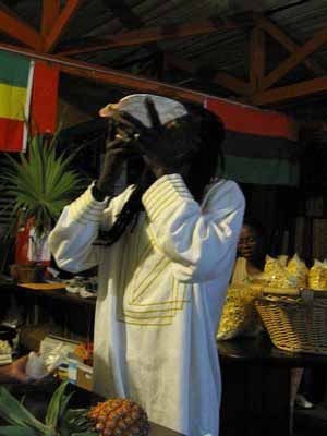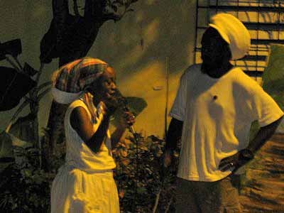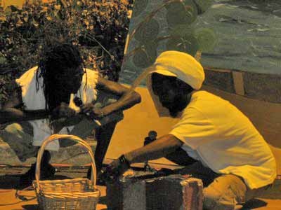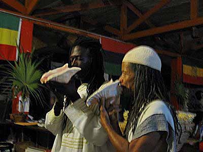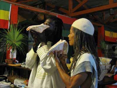 A lesson in conch shell blowing is in progress. |